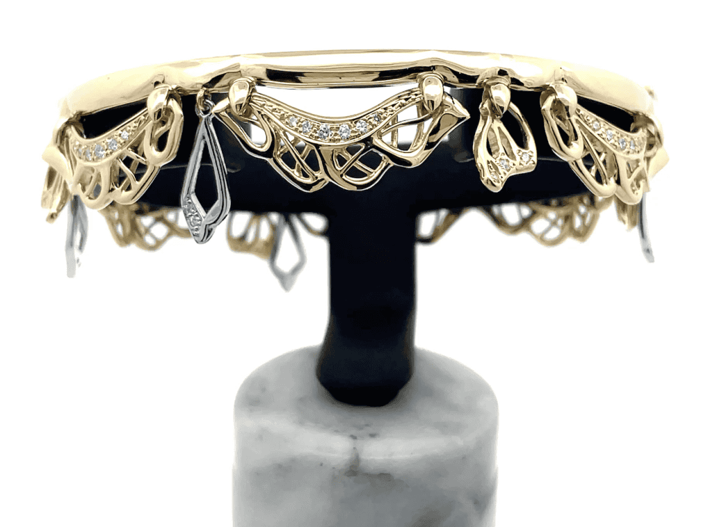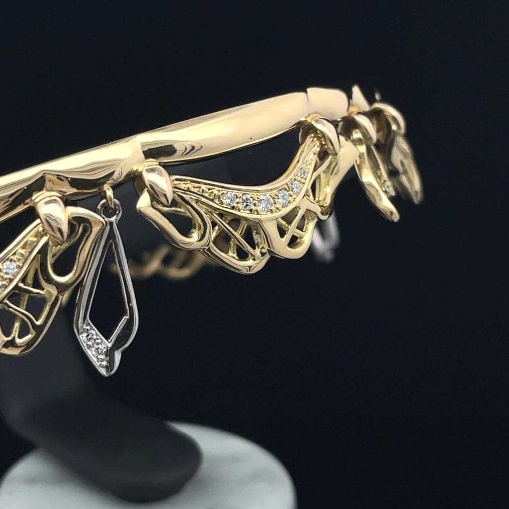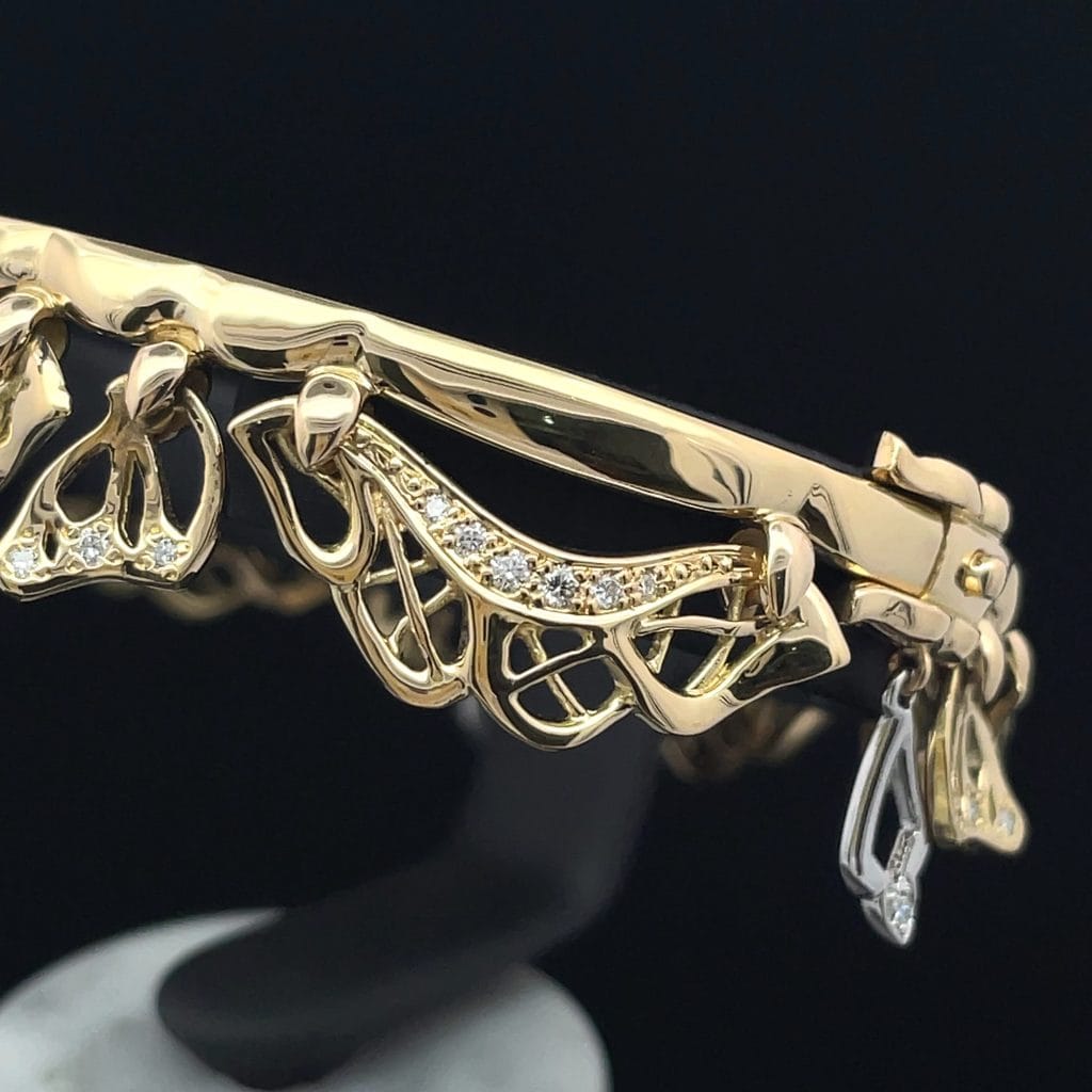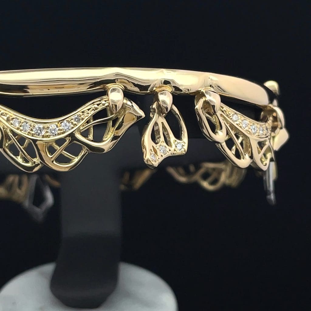 Handcrafted in 18ct yellow and white gold, the bangle is hand-set with 54 natural round brilliant-cut diamonds with a total diamond weight of 0.485ct. Weighing 40grams, the piece represents not only the beauty of its materials but the enduring worth of human creativity and collaboration.